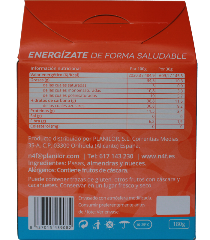 Tres de los frutos secos por excelencia. Combina el sabor de los tres, para aumentar tu energía de forma instantánea, de una forma saludable y sabrosa. Aporta gran cantidad de mega 6, magnesio, potasio, fibra, proteínas, vitaminas B y E...